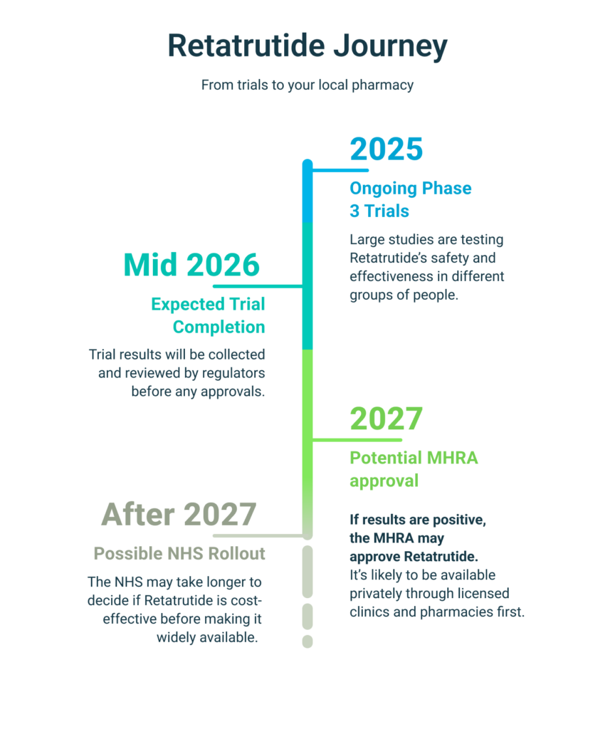 While it’s not yet approved in the UK or Ireland, Retatrutide is currently in late-stage clinical trials, with availability expected from 2026 onwards.